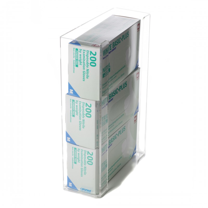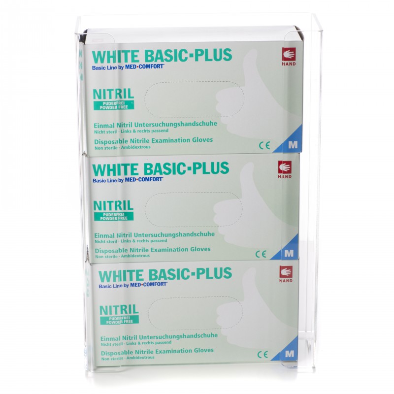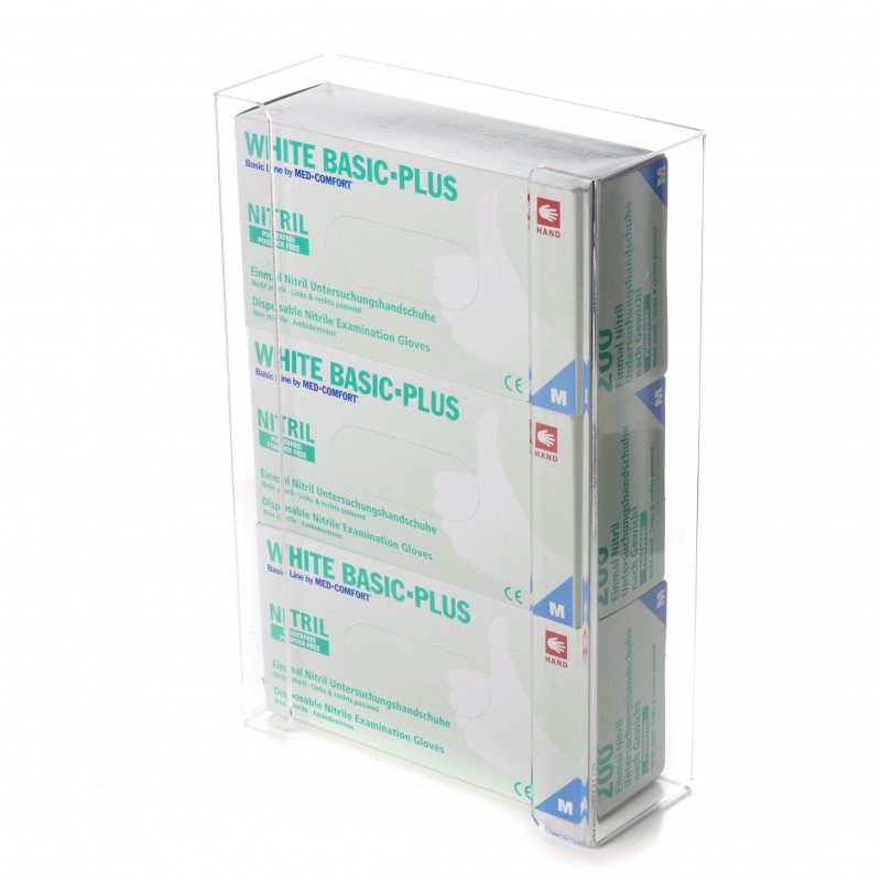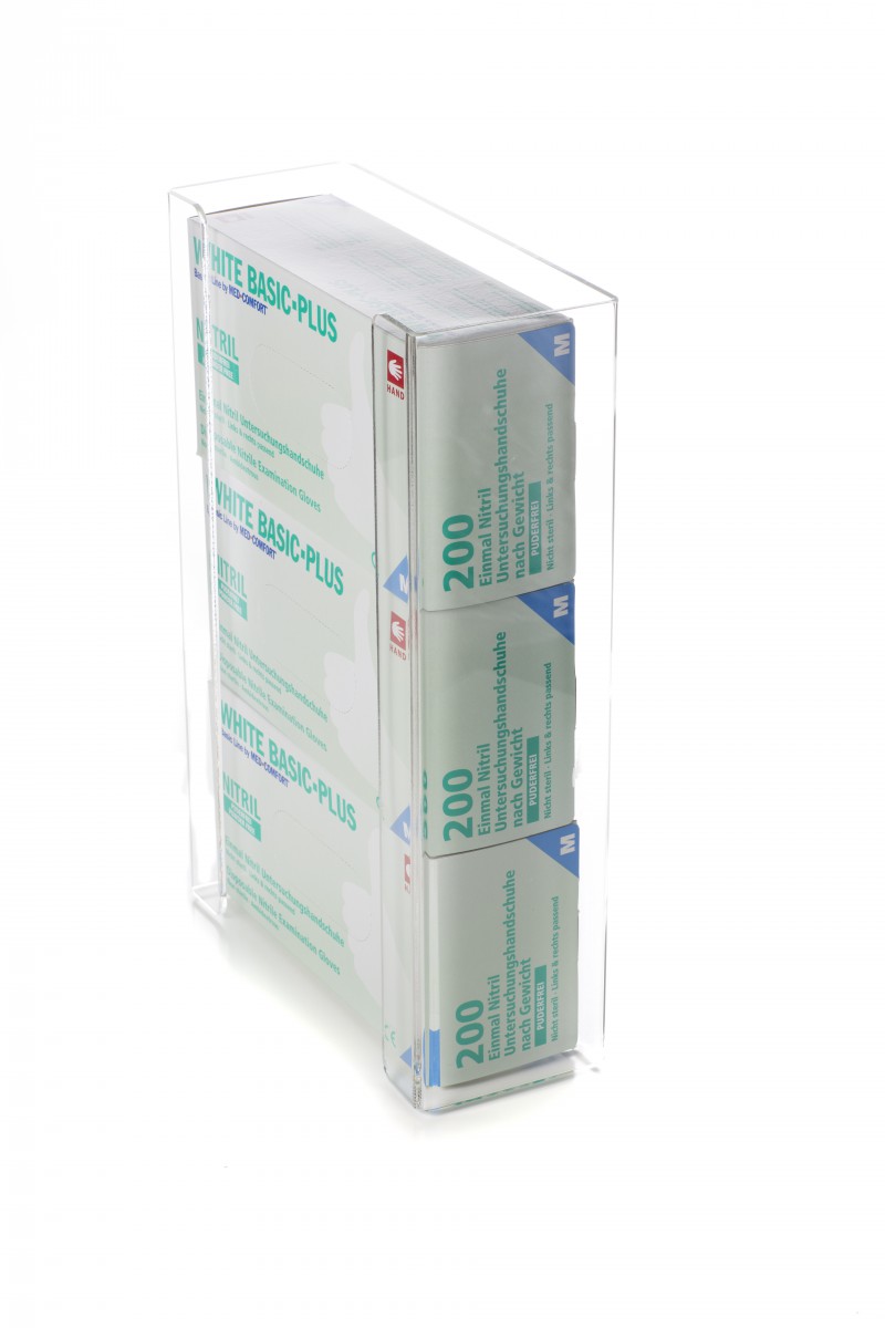 Handskhållare för väggmontage i transparent plexiglas. Ger en fast plats till handskar utan att ta upp bänkyta. Enkel tillgång till handskar med bara en hand tack vare att handskasken sitter på plats. Mått (bredd*höjd*djup) 27,5*40*10,5cm