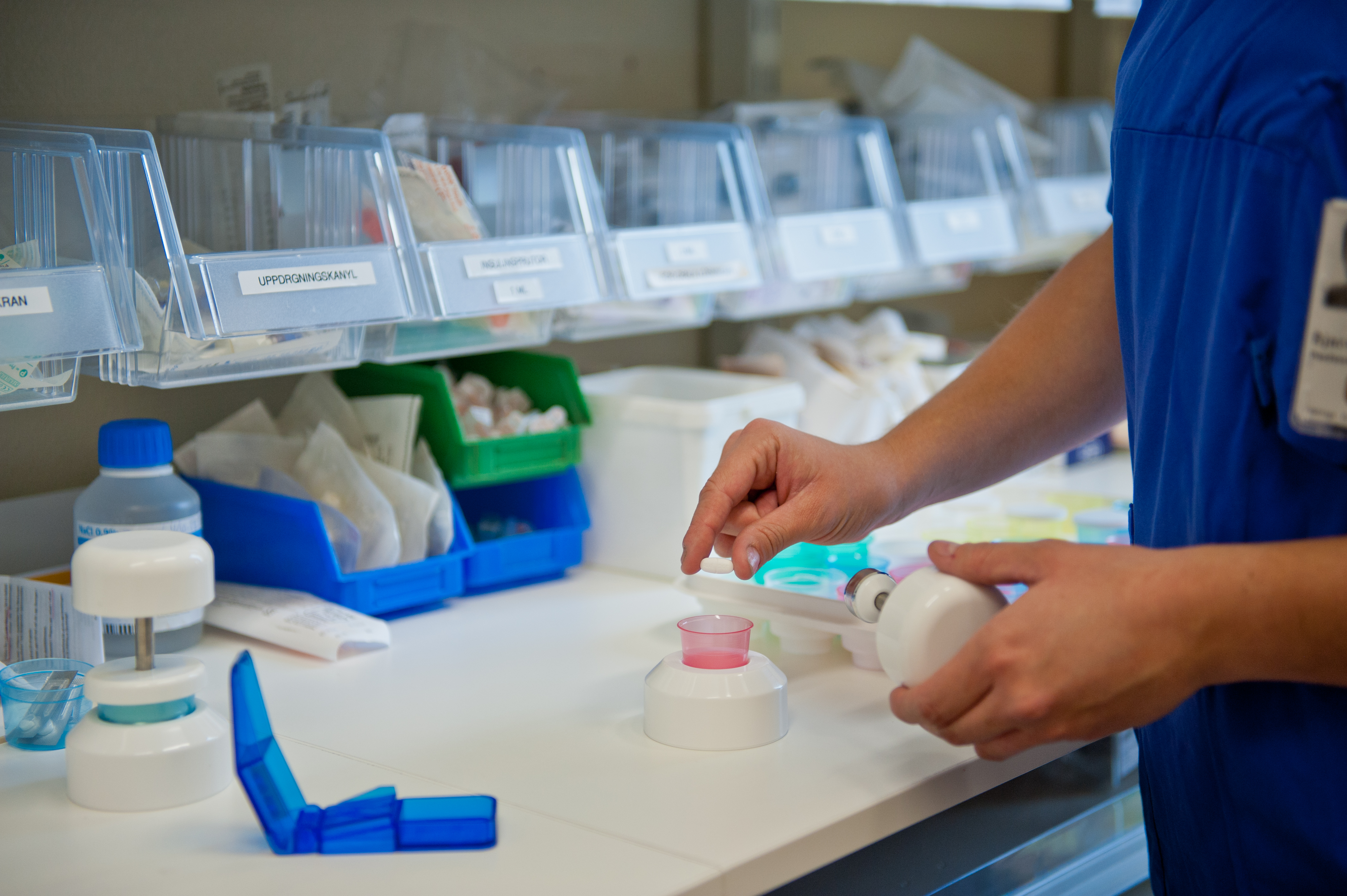Tablettkross som krossar tabletten direkt i en bred medicinbägare